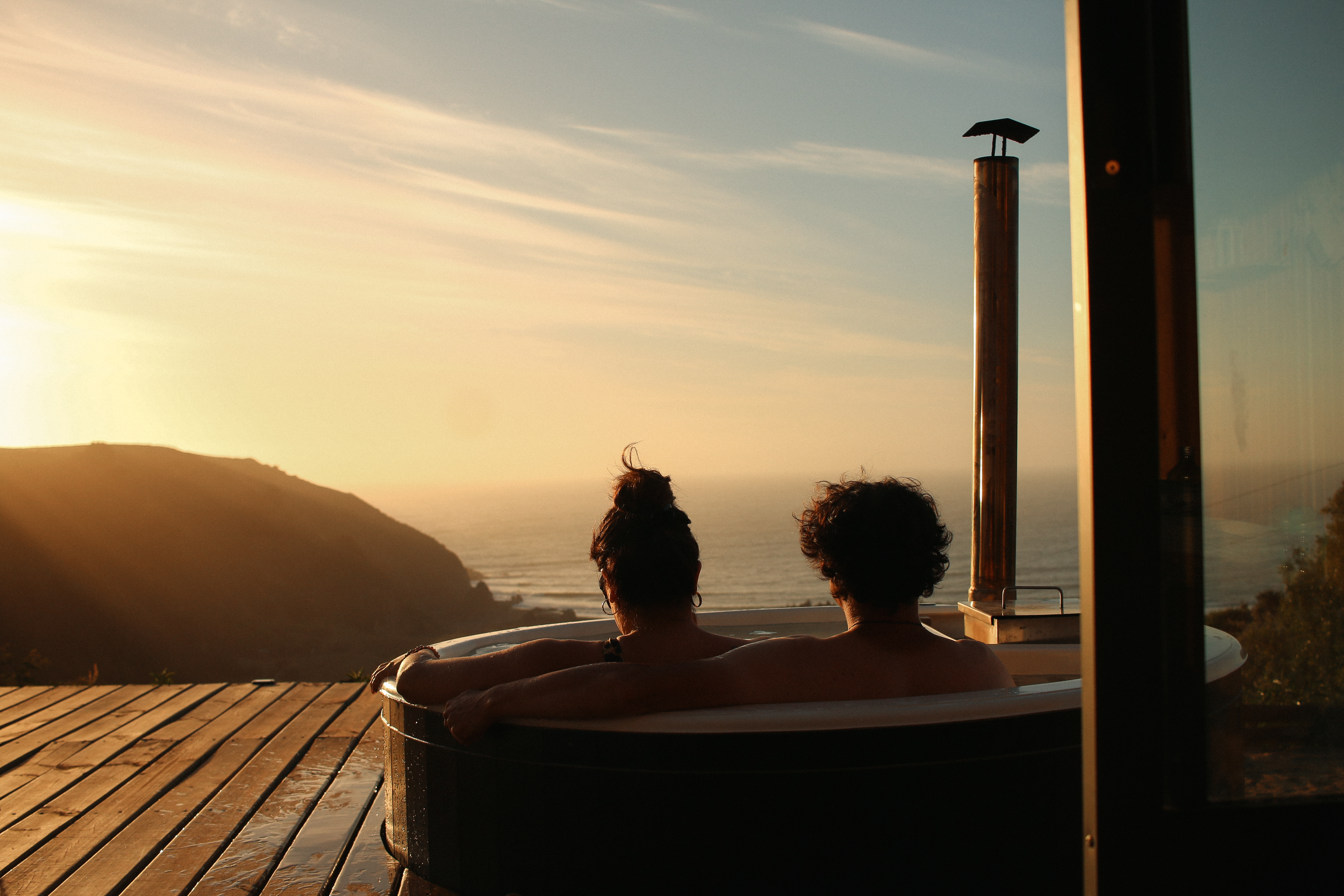 Una experiencia de relajo total al aire libre. Nuestra tinaja es una bañera circular de fibra de vidrio, climatizada con fuego a leña, ubicada en tu terraza con vista al mar.